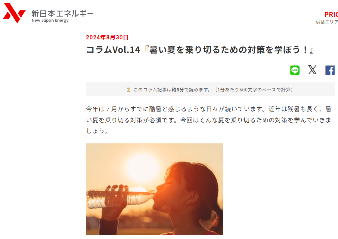 株式会社NEXT ONEが運営する新日本エネルギー内のコラムにて「暑い夏を乗り切るための対策を学ぼう!」というタイトルで記事執筆いたしました。