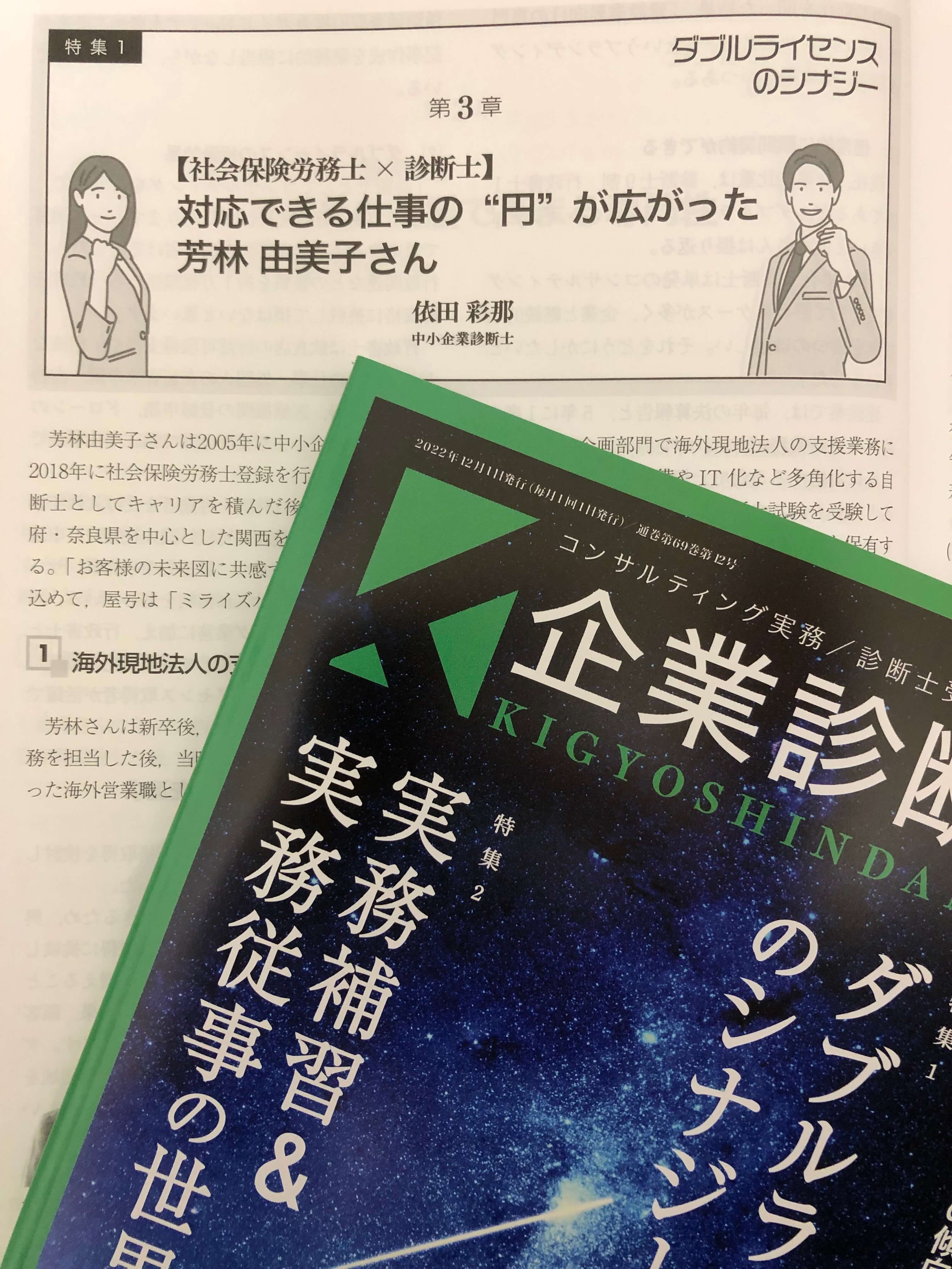 この度、株式会社同友館の月刊誌『企業診断』「ダブルライセンスのシナジー」の第3章にて社会保険労務士・中小企業診断士 芳林由美子先生を取材しました。