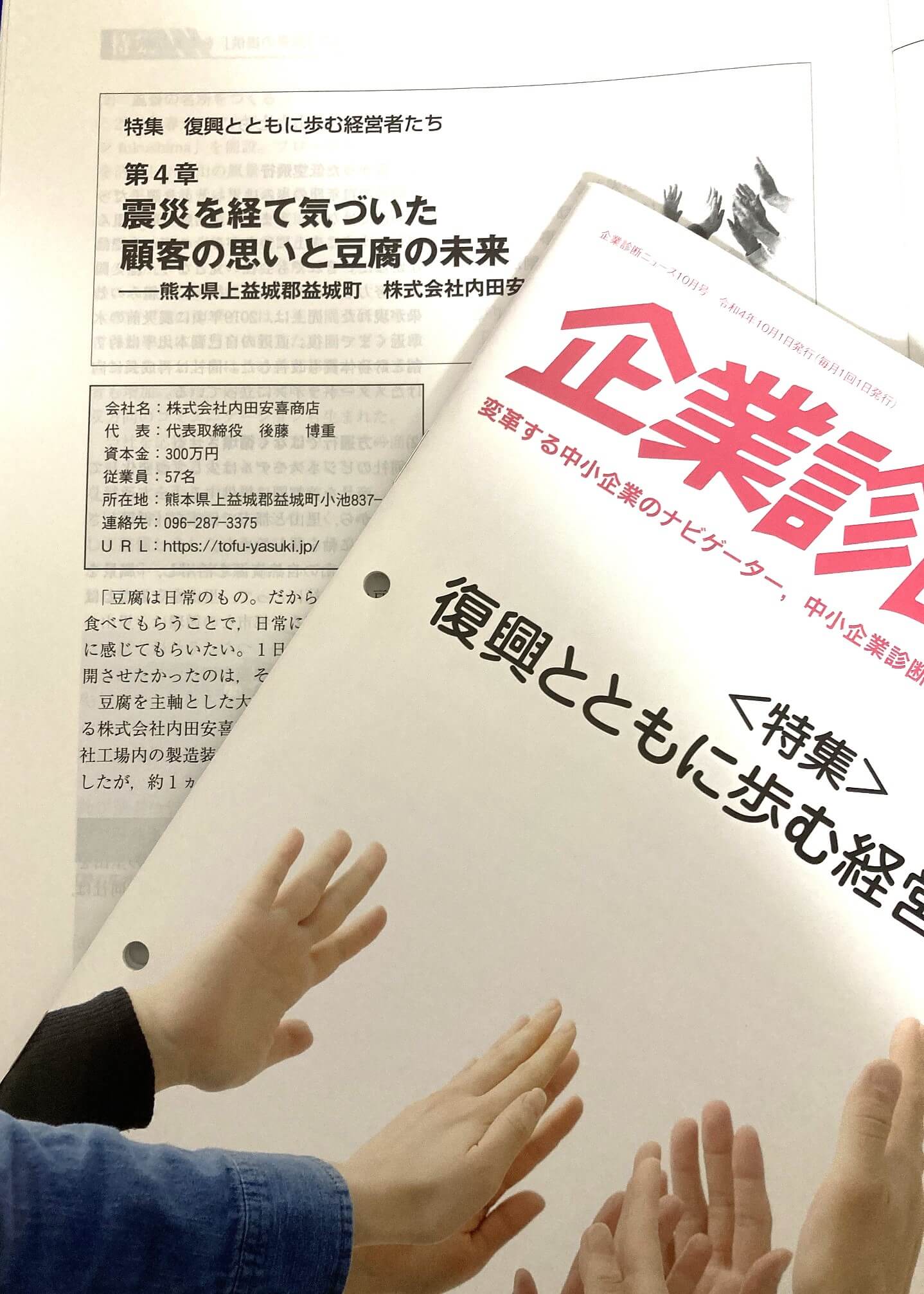 この度中小企業診断協会の会報誌『企業診断ニュース』の特集「復興とともに歩む経営者たち」の第4章 震災を経て気づいた顧客の思いと豆腐の未来(取材先:株式会社内田安喜商店)を執筆しました。