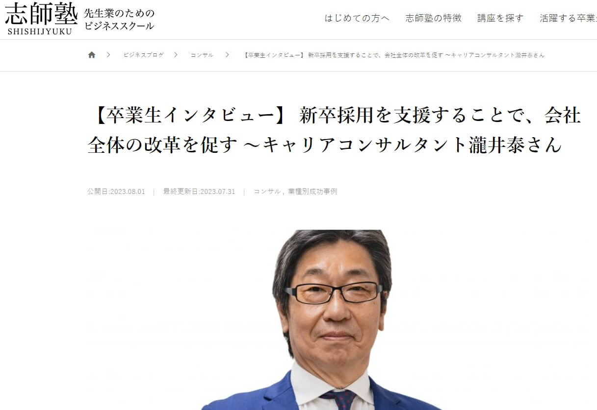 このたび、 株式会社エクスウィルパートナーズ様の志師塾ウェブサイトで瀧井泰様のインタビュー記事「新卒採用を支援することで会社全体の改革を促す」