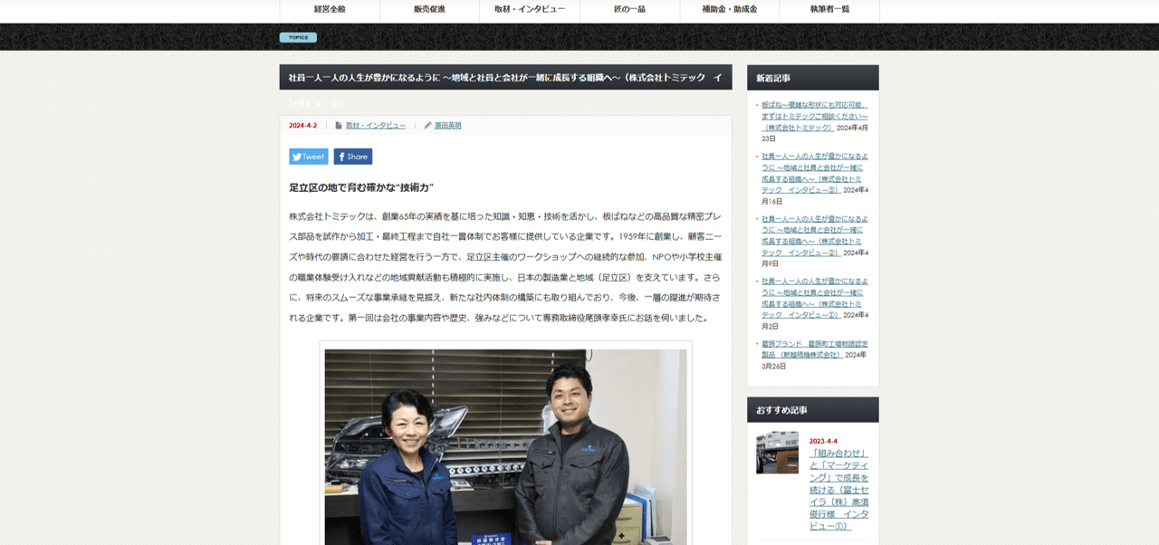 このたび、「大田区から広がる! 日本の町工場応援メディア『創×造/SO-ZO』」において、東京都足立区の株式会社トミテック様を取材・執筆いたしました。