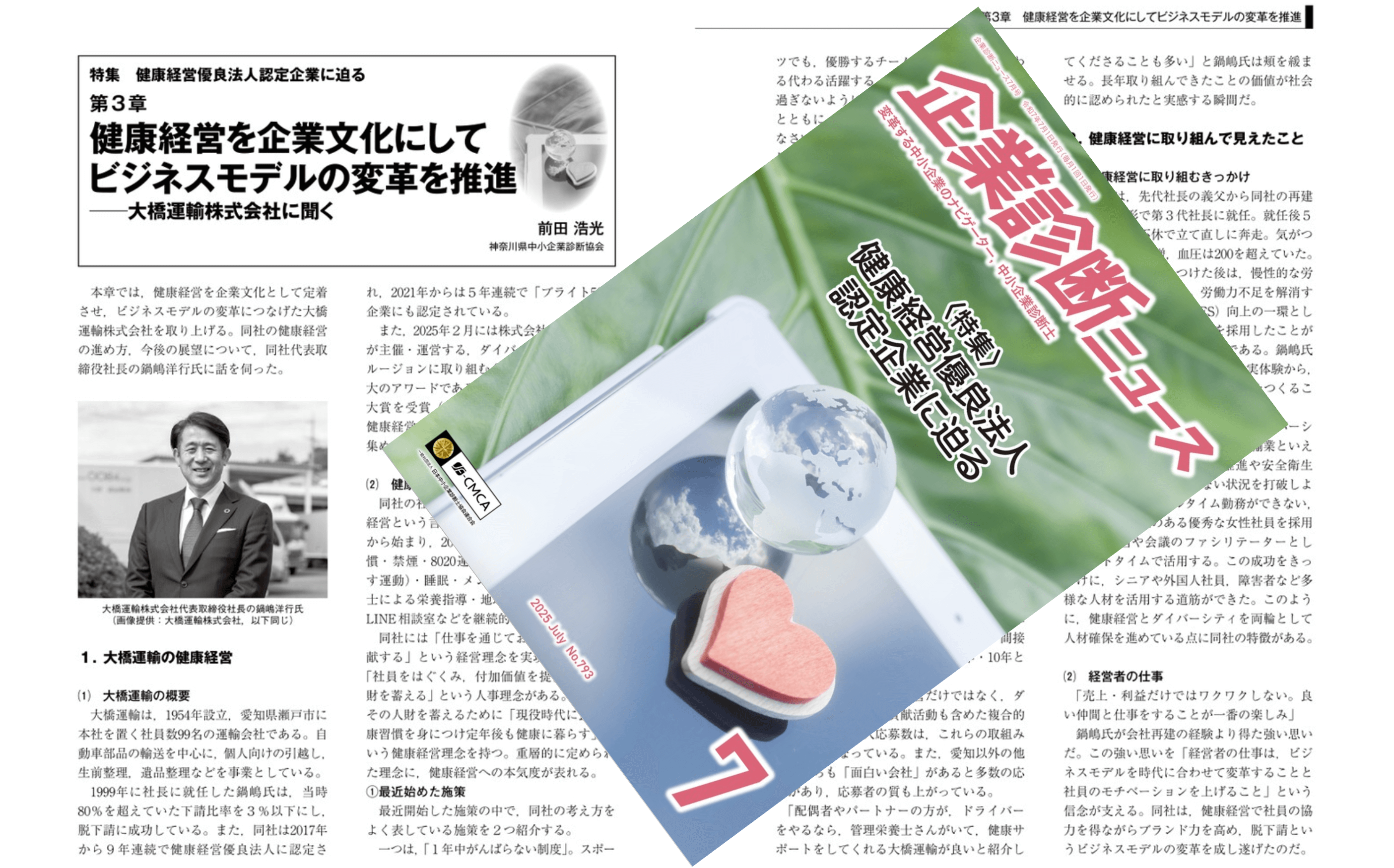 このたび、日本中小企業診断士協会連合会の会報誌『企業診断ニュース』2025年7月号にて、特集「健康経営優良法人認定企業に迫る」の第3章「健康経営を企業文化にしてビジネスモデルの変革を推進」を執筆させていただきました。