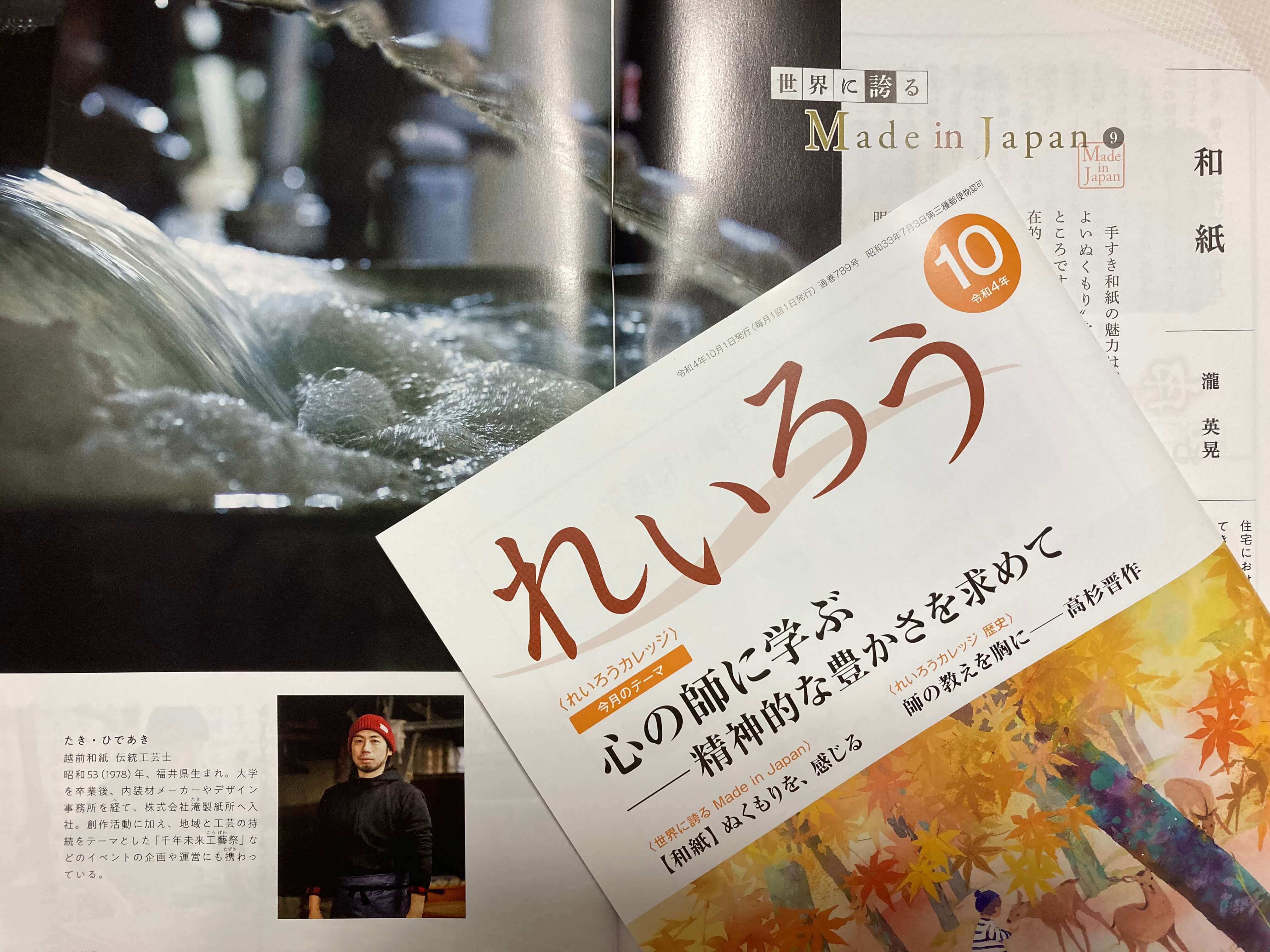 このたび、「れいろう」令和4年10月号「世界に誇る Made in Japan」にて、株式会社滝製紙所 瀧英晃氏インタビュー記事を執筆させていただきました。