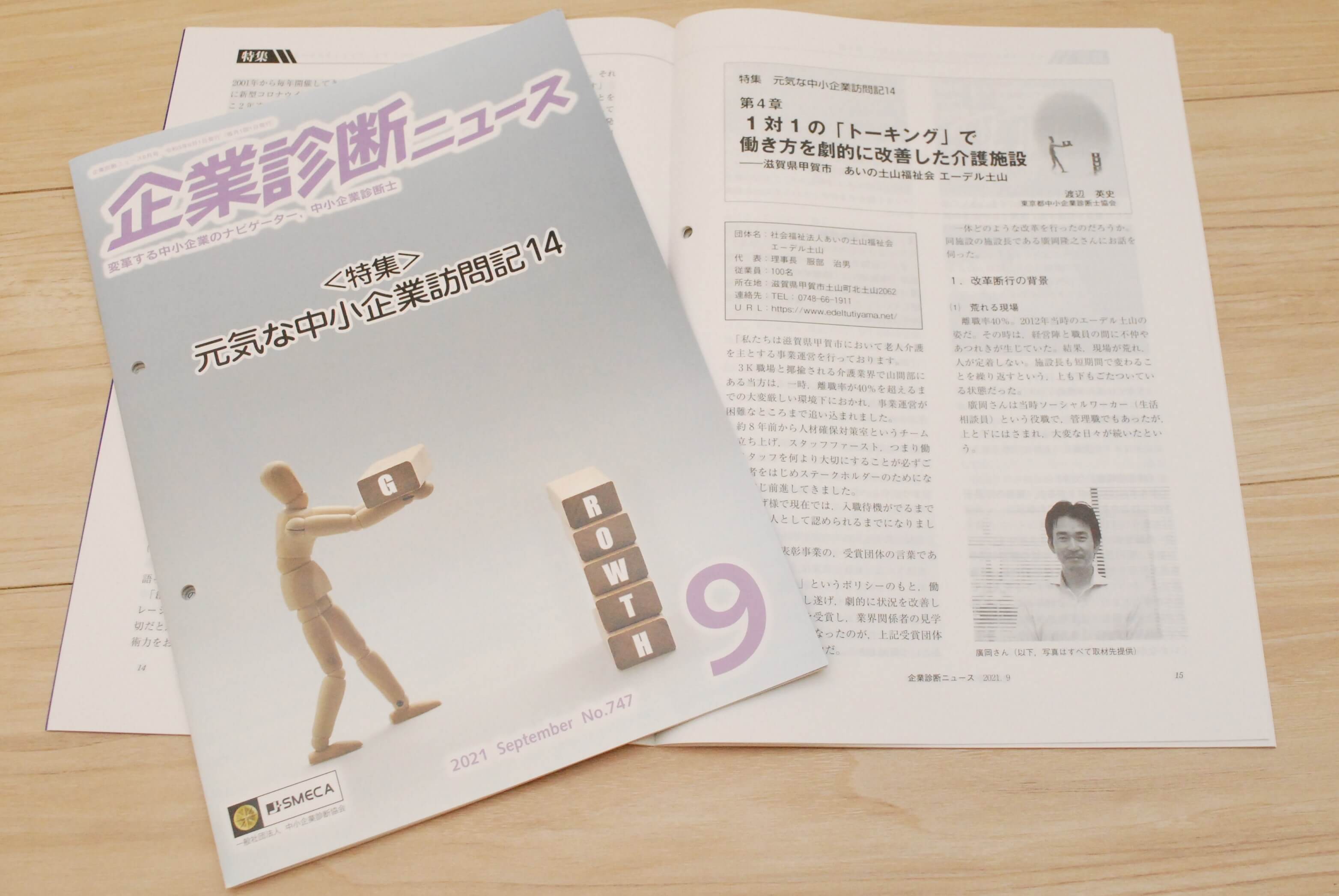 この度『企業診断ニュース』9月号にて、特集「元気な中小企業訪問記14」の第4章で、働き方の「変革」により危機を脱し変貌した介護施設「エーデル土山」を取材・執筆しました。