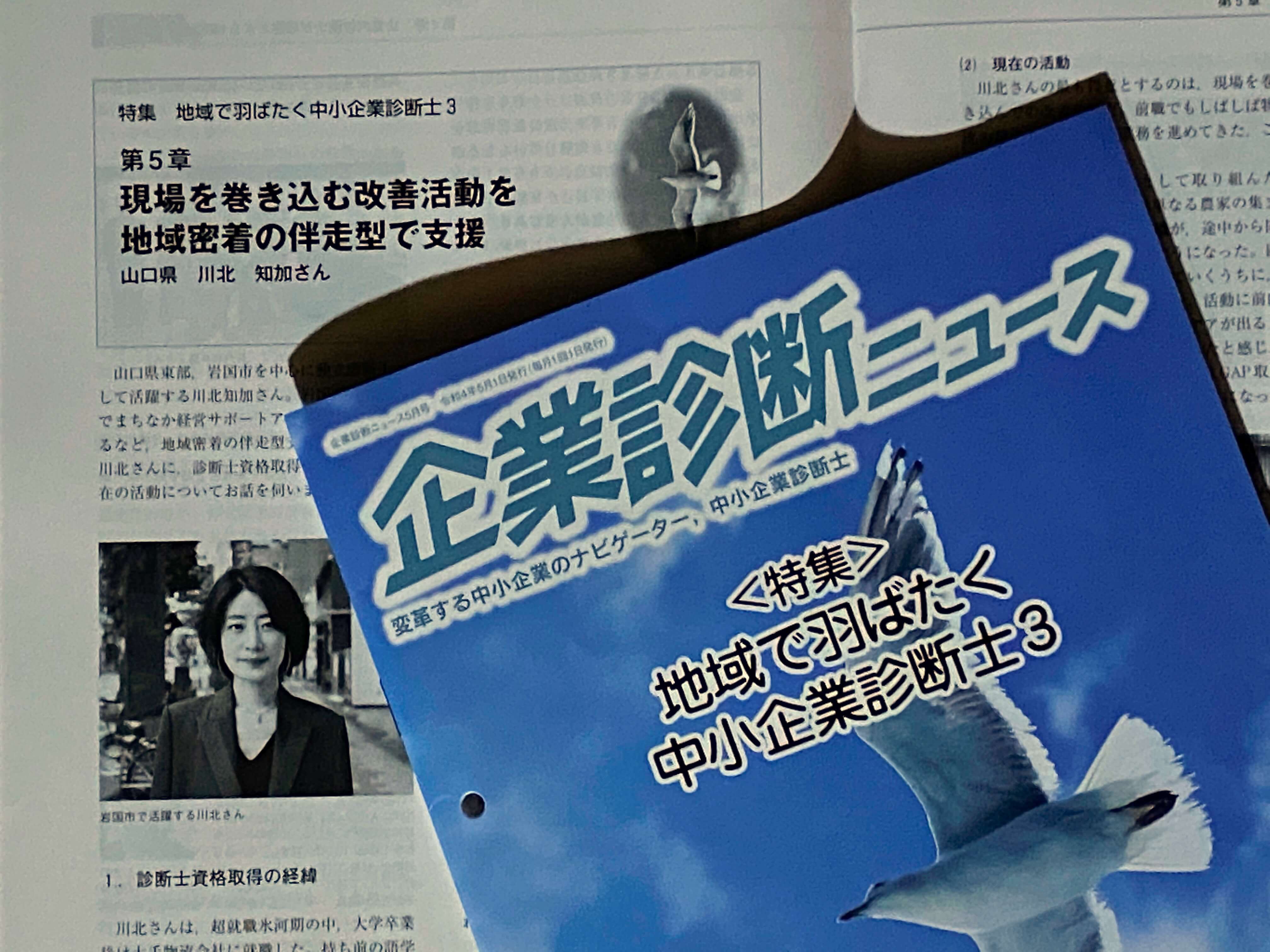 このたび中小企業診断協会の会報誌『企業診断ニュース』5月号の特集「地域で羽ばたく診断士3」第5章、川北 知加(かわきたともか)さんのインタビュー記事を執筆させていただきました。