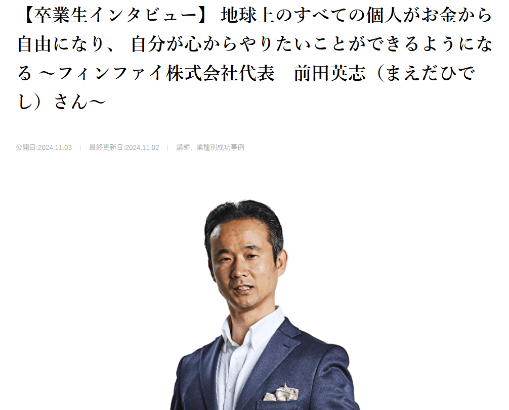 株式会社エクスウィルパートナーズ様の「先生ビジネス百科」に、志師塾卒業生である フィンファイ株式会社 代表 前田英志(まえだひでし)さんのインタビュー記事を執筆させていただきました。