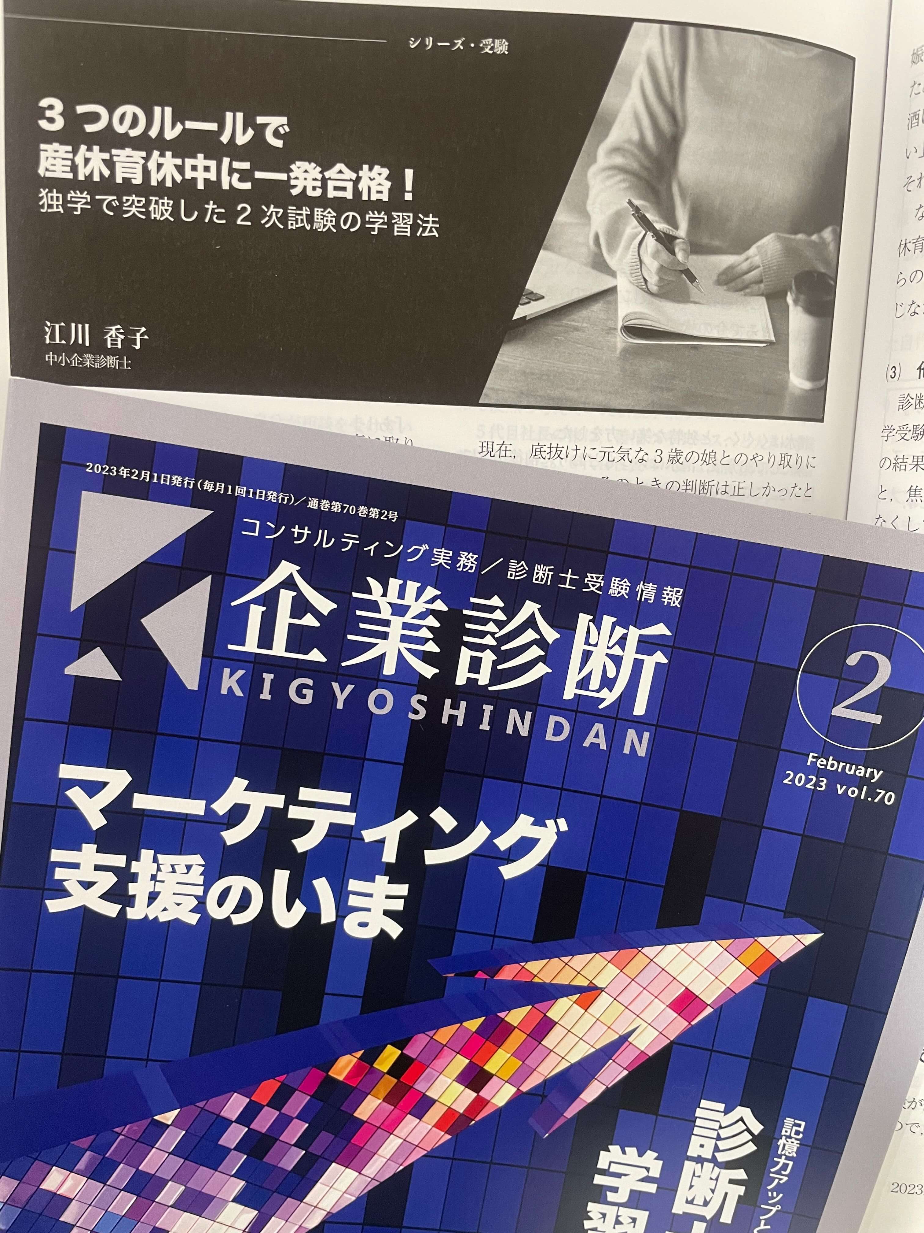 この度、月刊『企業診断』2月号、シリーズ・受験「3つのルールで産休育休中に一発合格!独学で突破した2次試験の学習法」を執筆しました。