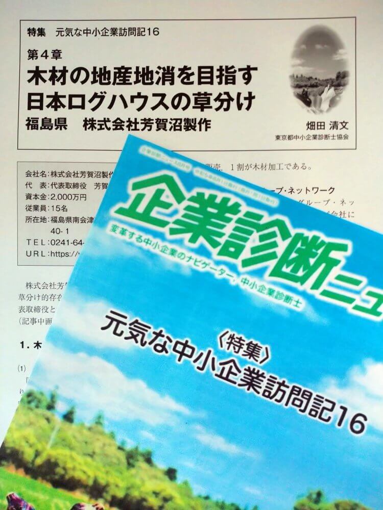 このたび、中小企業診断協会の会報誌『企業診断ニュース』2023年8月号にて、特集「元気な中小企業訪問記16」の第4章「木材の地産地消を目指す 日本ログハウスの草分け」を執筆させていただきました。