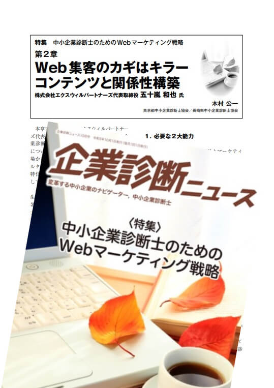 このたび、中小企業診断協会の会報誌『企業診断ニュース』2023年10月号にて、特集記事「中小企業診断士のためのWebマーケティング戦略」の第2章「Web集客のカギはキラーコンテンツと関係性構築」を執筆させていただきました(第1章も執筆)。