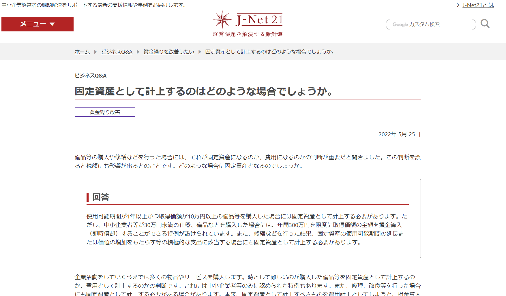 このたび、J-Net21、ビジネスQ&Aに「固定資産として計上するのはどのような場合でしょうか。」というタイトルで記事を執筆させていただきました。