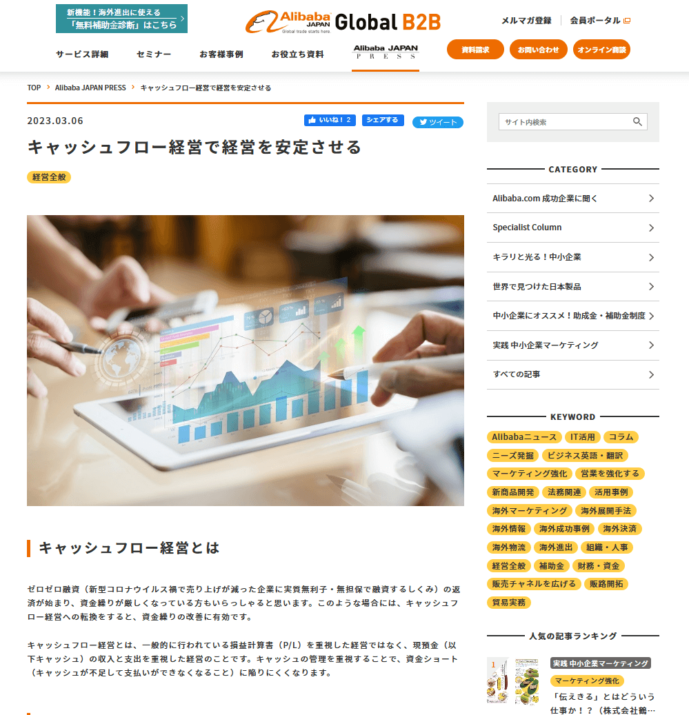 このたび、アリババジャパンプレスで「キャッシュフロー経営で経営を安定させる」というタイトルで記事を執筆させていただきました。