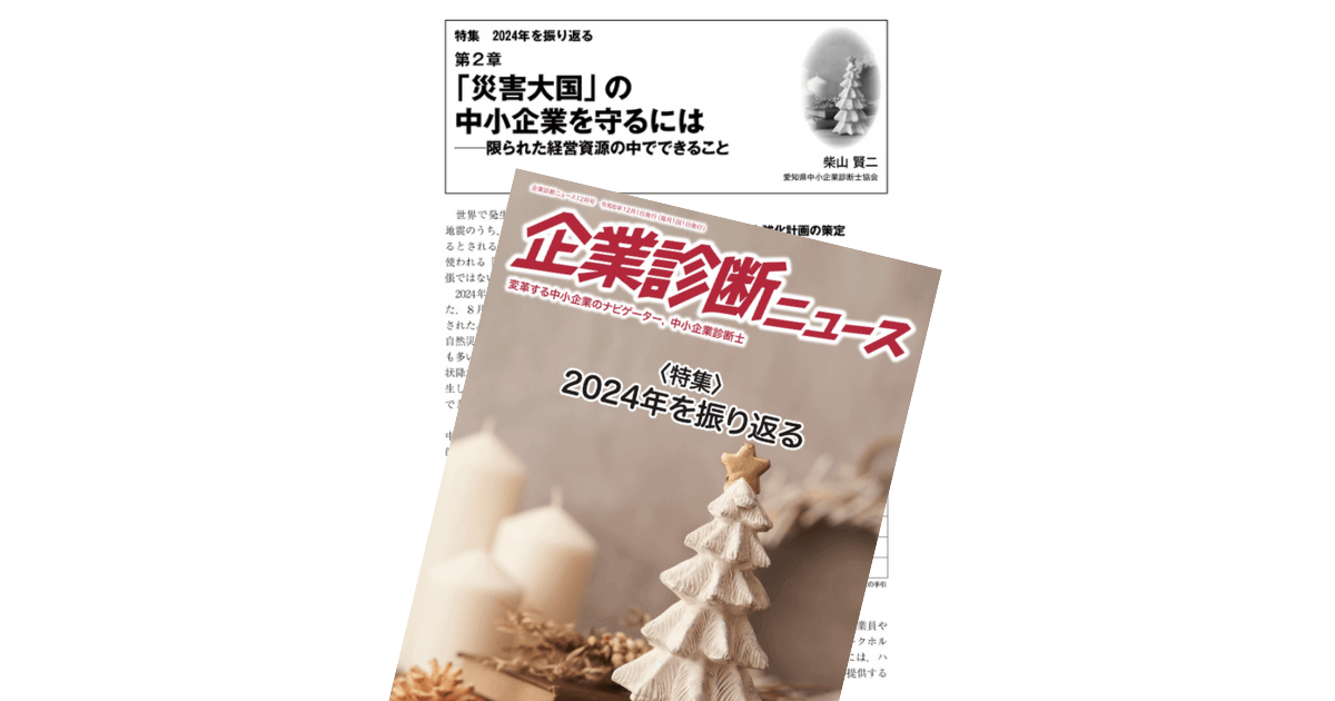 このたび、日本中小企業診断士協会連合会の会報誌『企業診断ニュース』2024年12月号にて、特集「2024年を振り返る」の第2章「『災害大国』の中小企業を守るには –限られた経営資源の中でできること」を執筆させていただきました。
