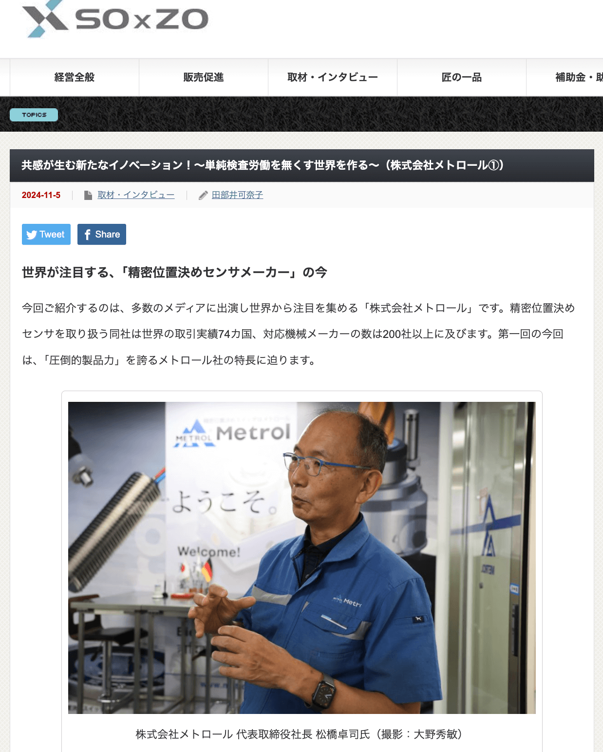 この度、「大田区から広がる!日本の町工場応援メディア『創×造/SO-ZO』」にて、精密位置決めセンサメーカである「株式会社メトロール」の取材記事を執筆させていただきました。