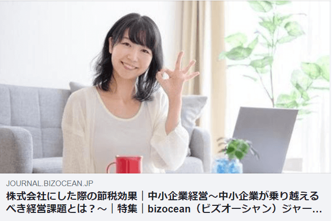 このたび、ビズオーシャン(bizocean)サイトにて「株式会社にした際の節税効果」を執筆させていただきました。