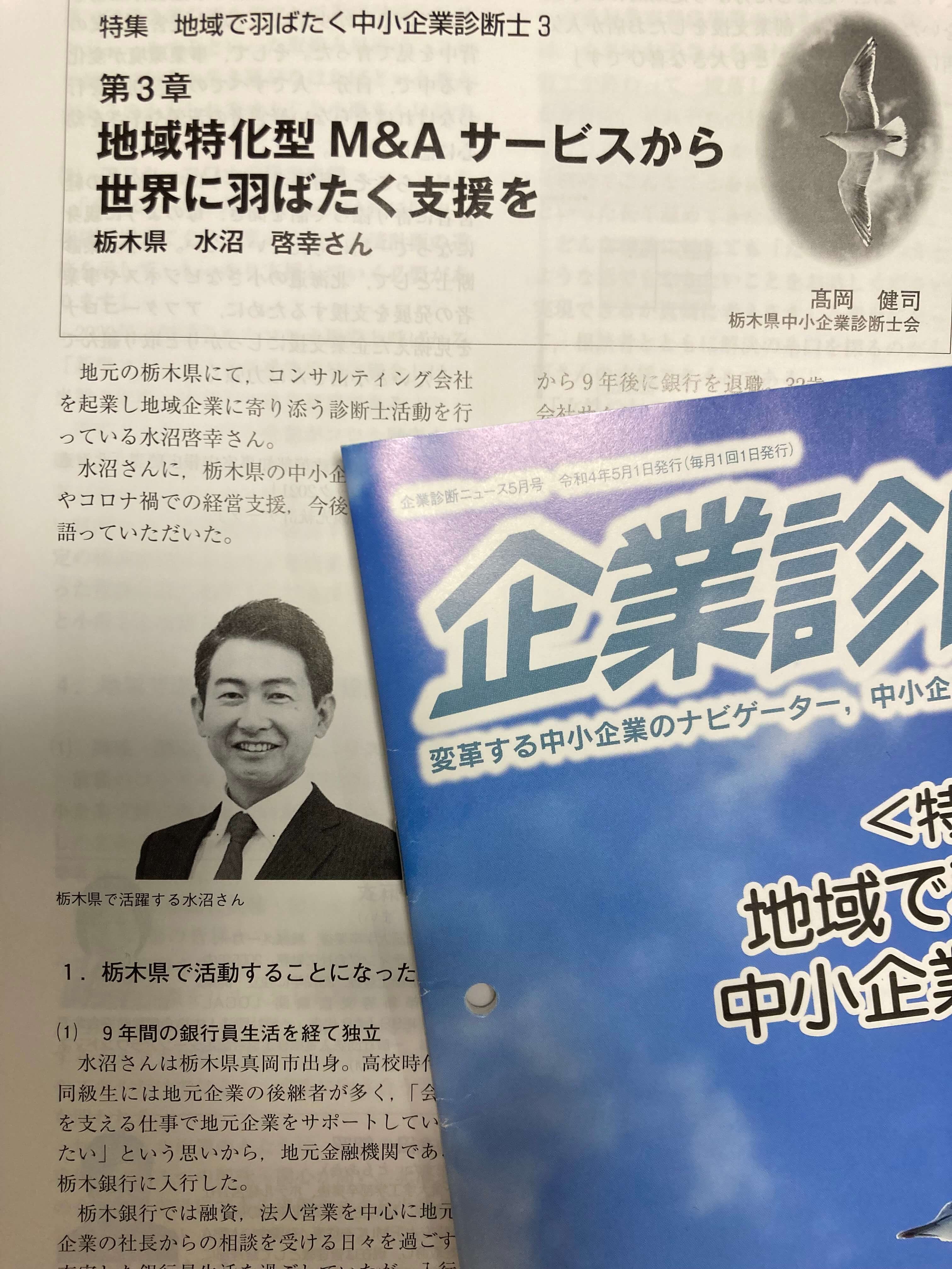 このたび中小企業診断協会の会報誌『企業診断ニュース』5月号の特集「地域で羽ばたく中小企業診断士3」第3章、水沼啓幸さんのインタビュー記事を執筆させていただきました。