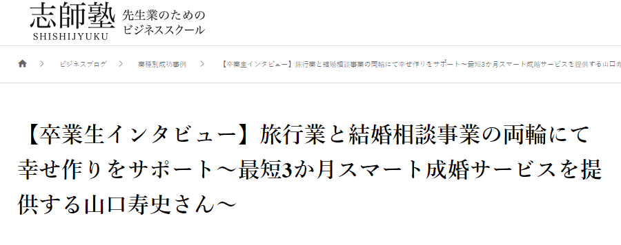 山口さんが結婚相談事業を開始した経緯や志師塾で学んだことや業務に活かしていることを紹介しています。是非ご一読願います。