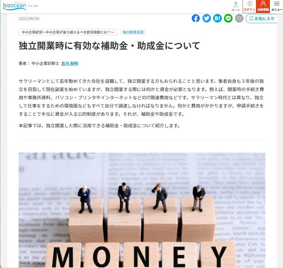 このたび、ビズオーシャン様のサイトにて「独立開業時に有効な補助金・助成金について」を執筆させていただきました。