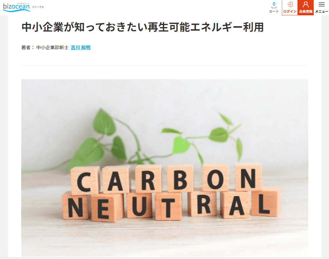 このたび、ビズオーシャン様のサイトにて「中小企業が知っておきたい再生可能エネルギー利用」を執筆させていただきました。