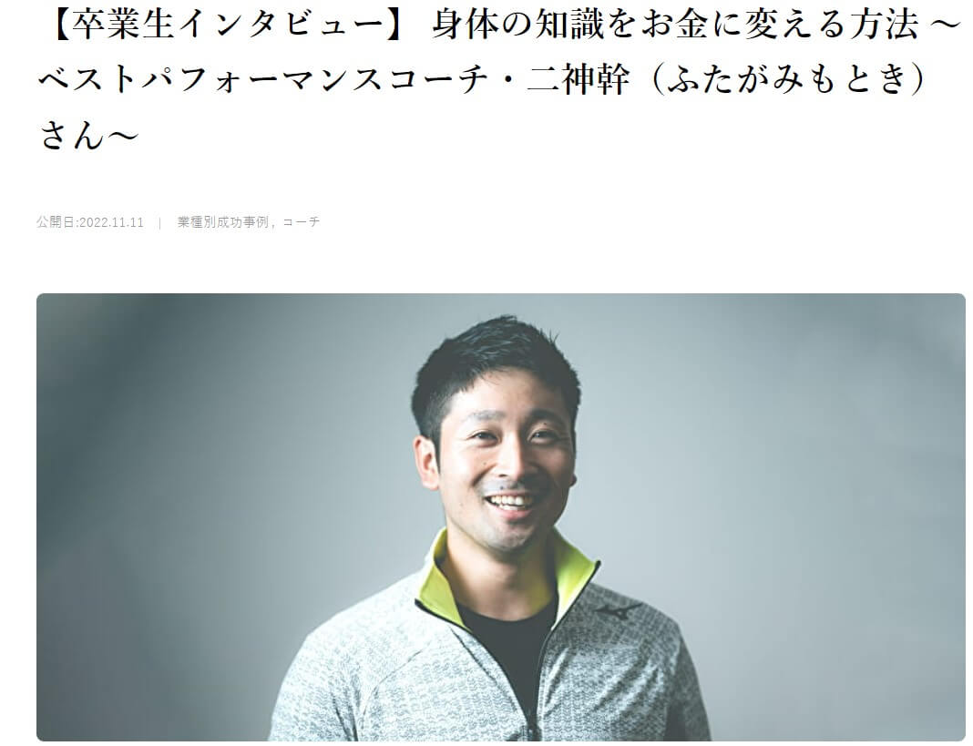 二神さんはトレーニングコーチとして独立し活躍されています。志師塾での教えがきっかけで人脈形成・売上倍増に繋がっています。あらゆる先生業で起業を目指す方にとって参考になるはずです。