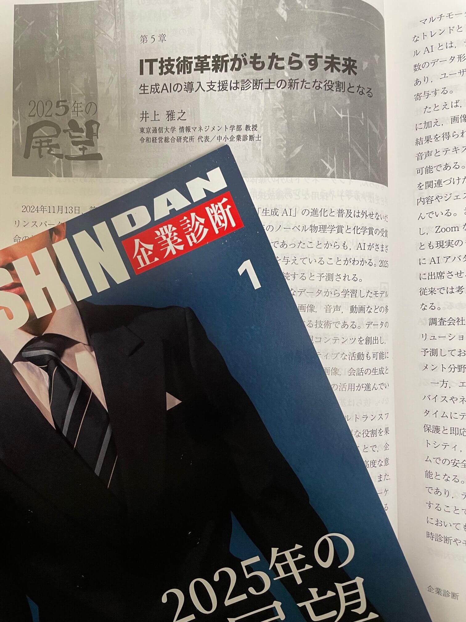 この度、同友館発行『企業診断』2025年1月号の特集記事「2025年の展望」第5章「IT技術革新がもたらす未来–生成AIの導入支援は診断士の新たな役割となる–」の執筆を担当させていただきました。