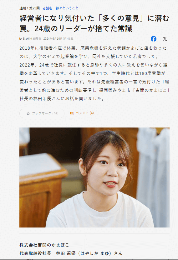 この度、ビズヒントで「株式会社吉開のかまぼこ」の林田茉優社長のインタビュー記事を執筆いたしました。