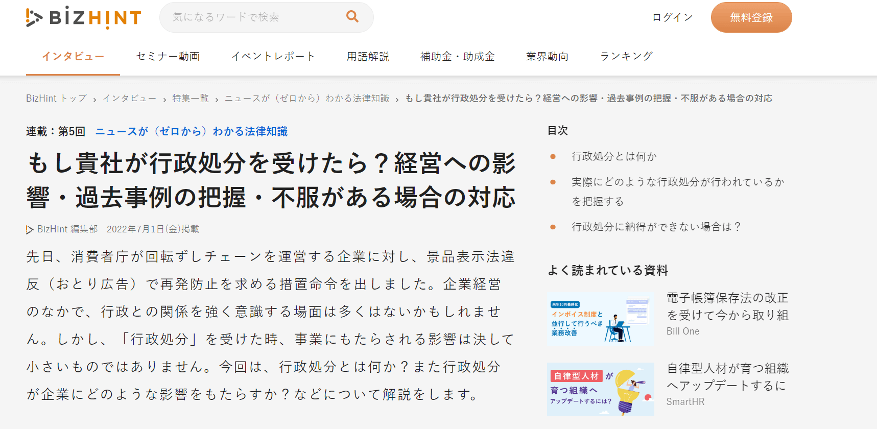 このたび、ビジョナル・インキュベーション株式会社が運営するBIZ HINTに当職が起案した「もし貴社が行政処分を受けたら?経営への影響・過去事例の把握・不服がある場合の対応」が登載されました。