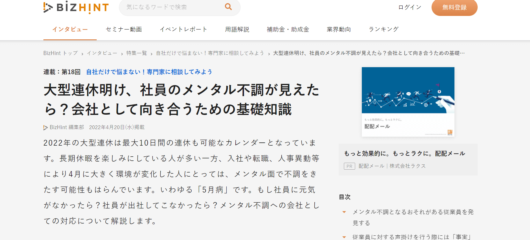 このたび、ビジョナル・インキュベーション株式会社が運営する「BizHint」(ビズヒント)に「大型連休明け、社員のメンタル不調が見えたら?会社として向き合うための基礎知識」と題するコラムを執筆いたしました。