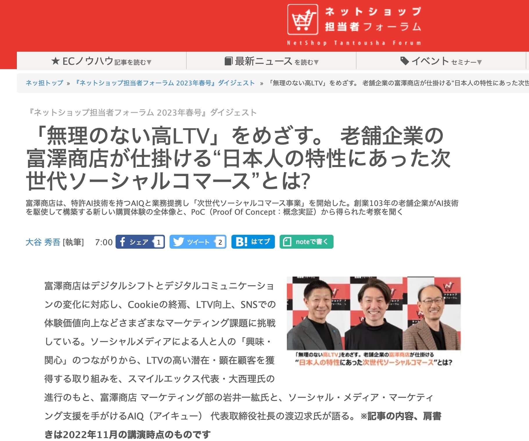 このたび、 株式会社インプレス社の「ネットショップ担当者フォーラム 2023年春号」の「『無理のない高LTV』を目指す。老舗企業の富澤商店が仕掛ける“日本人の特性にあった次世代ソーシャルコマース”とは?」を執筆させていただきました。