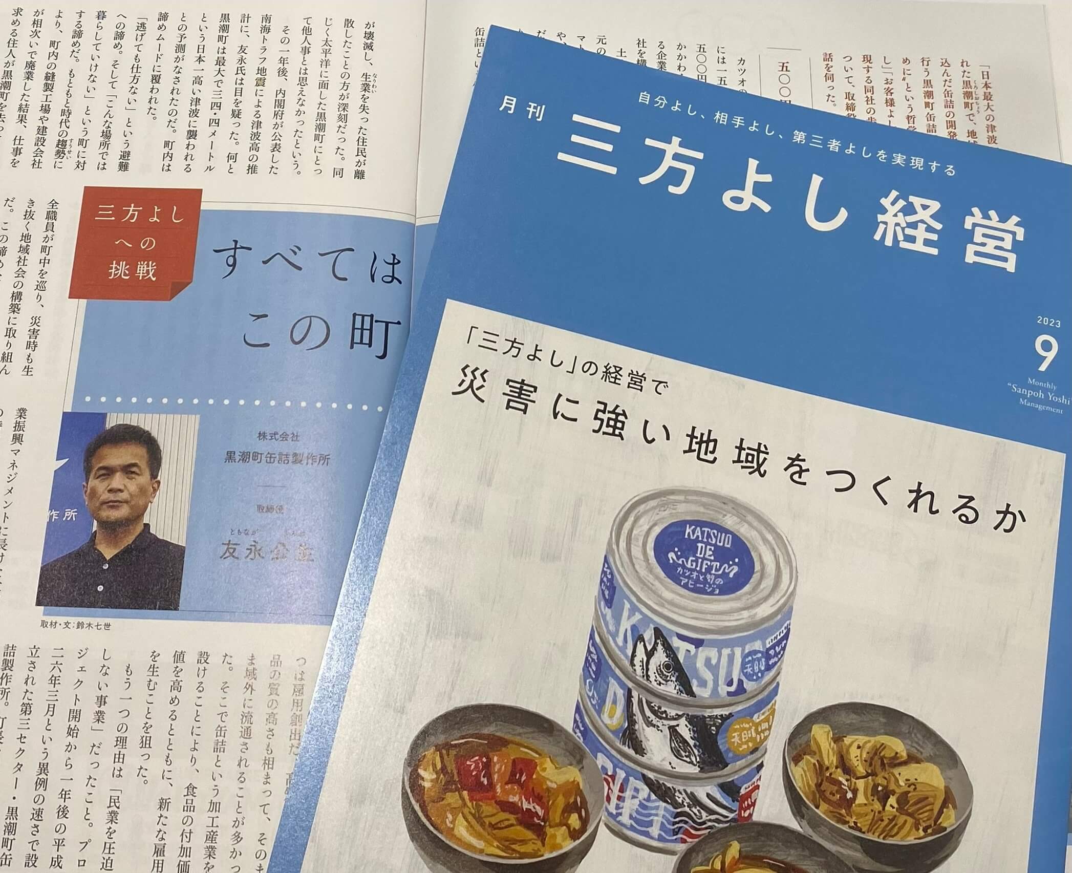 本記事では、地域の食材を詰め込んだ缶詰の開発から販売までを行う、株式会社黒潮町缶詰製作所の創業メンバーであり、現在取締役を務める友永公生様にお話を伺いました。日本最大級の津波が来る町とされた高知県黒潮町にて、「活動はすべて町のために」という哲学から付加価値を生み出してきた独自の姿勢は、三方よし経営の一つ在り方として参考になるかと思います。記事を通じて、同社の歩みや想いに触れることで、読者の皆さん個人や企業のあり方を問い直すきっかけにもなれば幸いです。雑誌「月刊三方よし経営」は、Webサイト『道徳の本屋さん』で購入することができます。ぜひご一読ください。