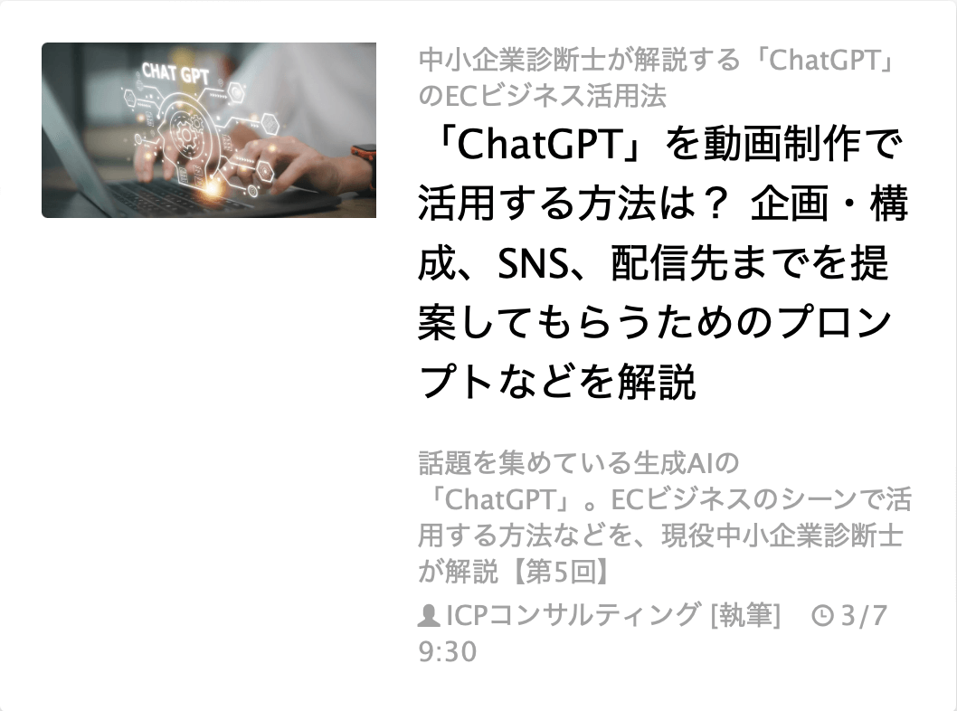 通販・ECのビジネスに関する情報サイト「ネットショップ担当者フォーラム」において、「ChatGPTを動画制作で活用する方法は?企画・構成、SNS、配信先までを提案してもらうためのプロンプトなどを解説」が掲載されました。