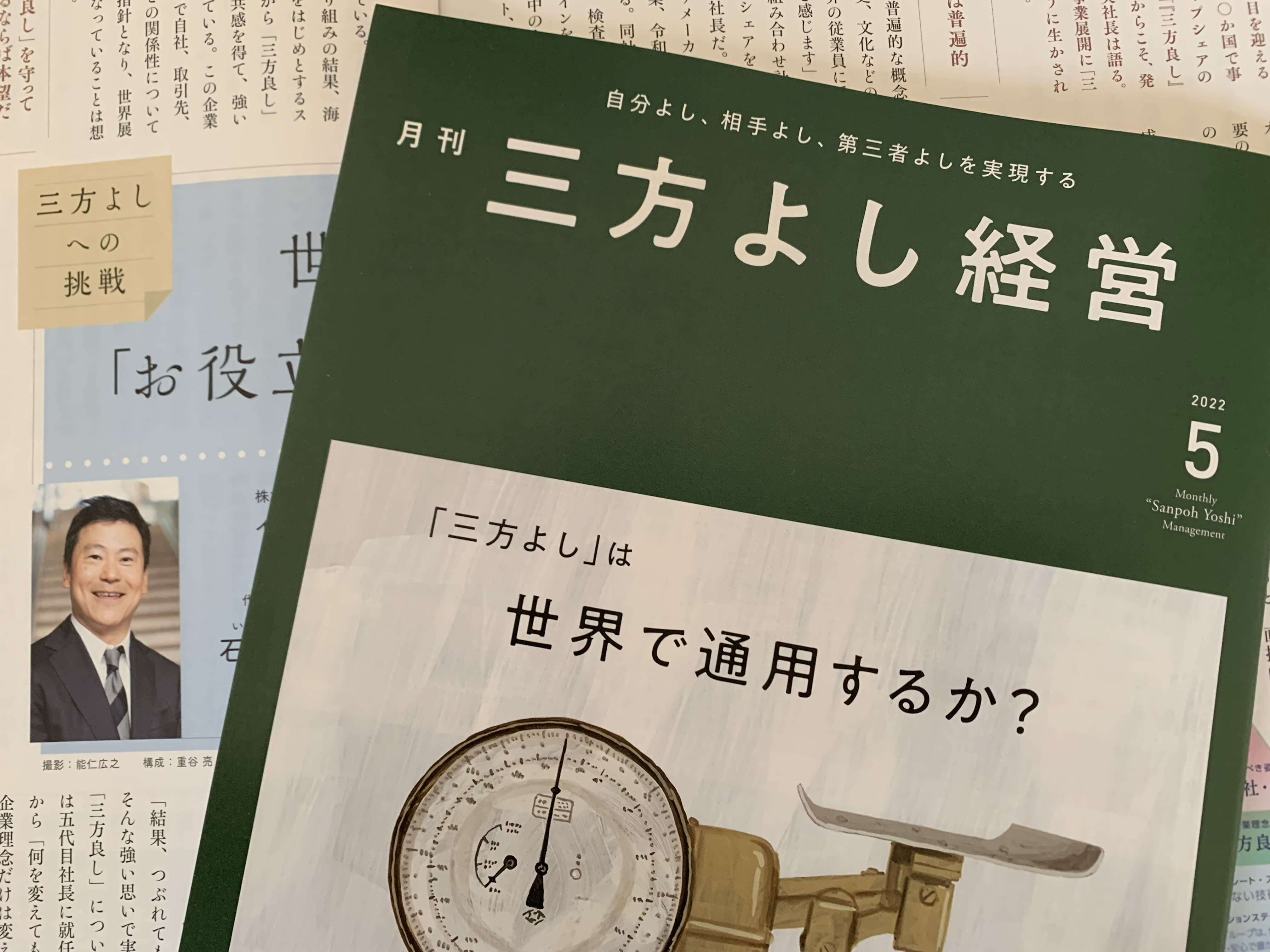 このたび、公益財団法人モラロジー道徳教育財団発行「月刊三方よし経営」令和4年5月号において「三方よしへの挑戦」の執筆を担当させていただきました。