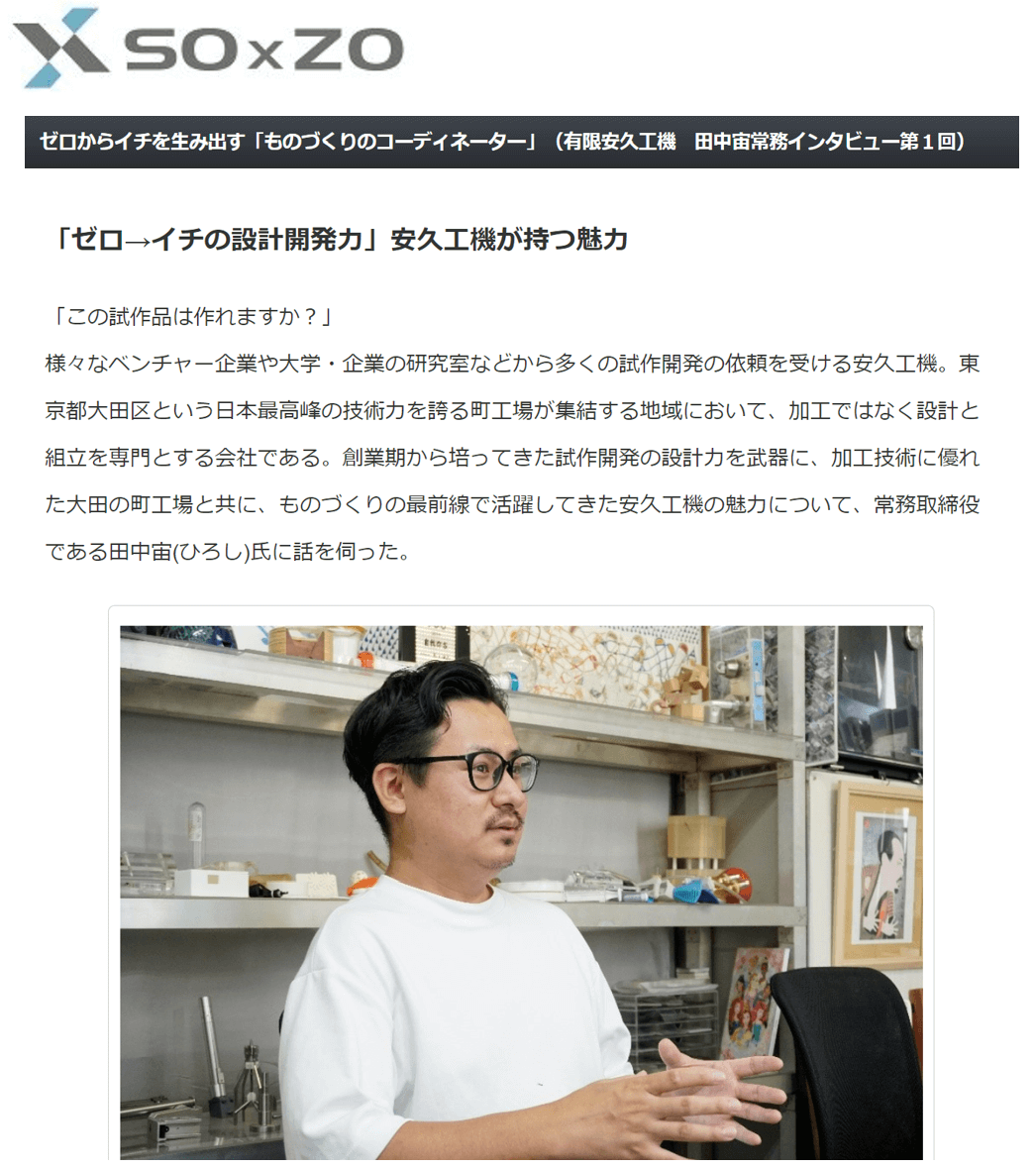 この度、「大田区から広がる! 日本の町工場応援メディア『創×造 / SO-ZO』」において、東京都大田区の(有)安久工機を取材・執筆いたしました。