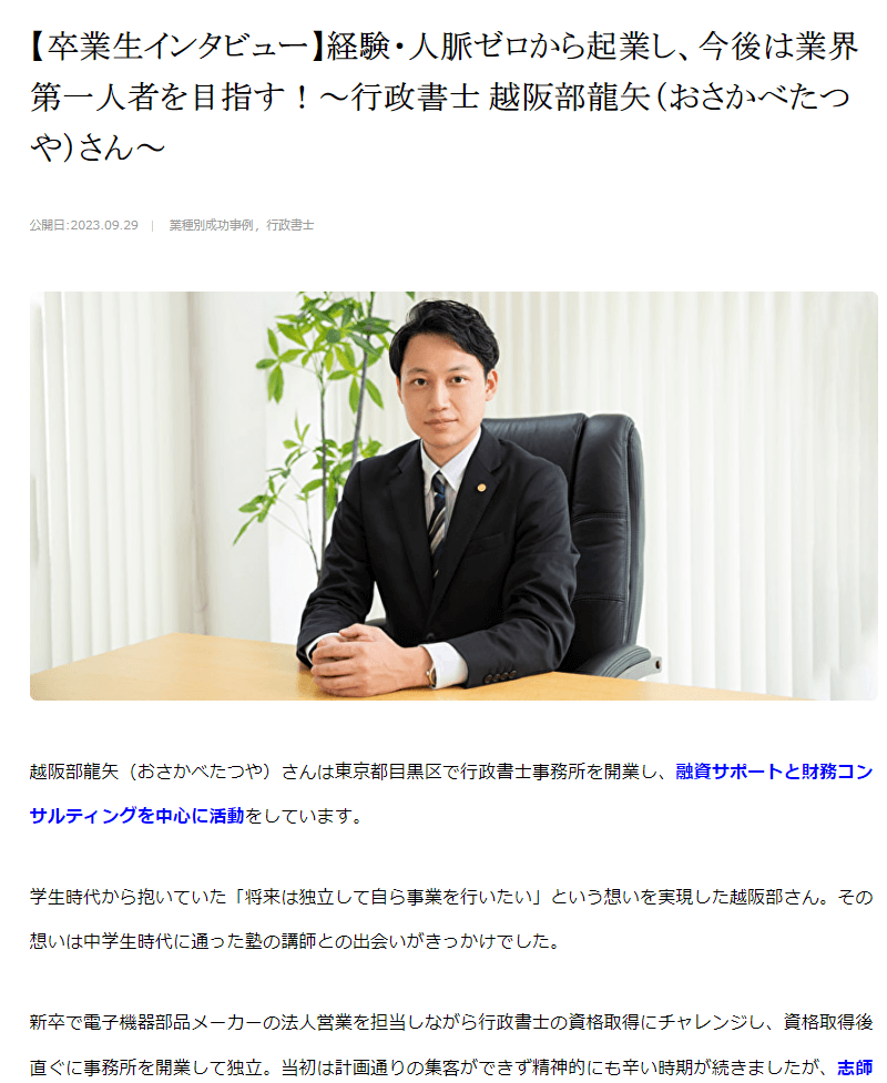 越阪部さんは東京都目黒区で行政書士事務所を開業し、現在は融資サポートと財務コンサルティングを中心に活動をしています。前職で電子機器部品メーカーの法人営業を経験した後、学生時代から抱いていた「将来は独立して自ら事業を行いたい」という想いを実現しました。開業当初は計画通りの集客ができず精神的にも辛い時期が続きましたが、志師塾で学んだことを愚直に実践していった結果、次第に紹介を受ける案件が増え、売上も安定するようになりました。既に「業界の第一人者になる」という将来に向けた大きな目標も見据えています。今回の取材では、越阪部さんの行政書士として独立するまでの経緯や飛躍のきっかけになった志師塾について、さらに今後の目標やビジネスの方針などをうかがいました。ぜひご一読ください。