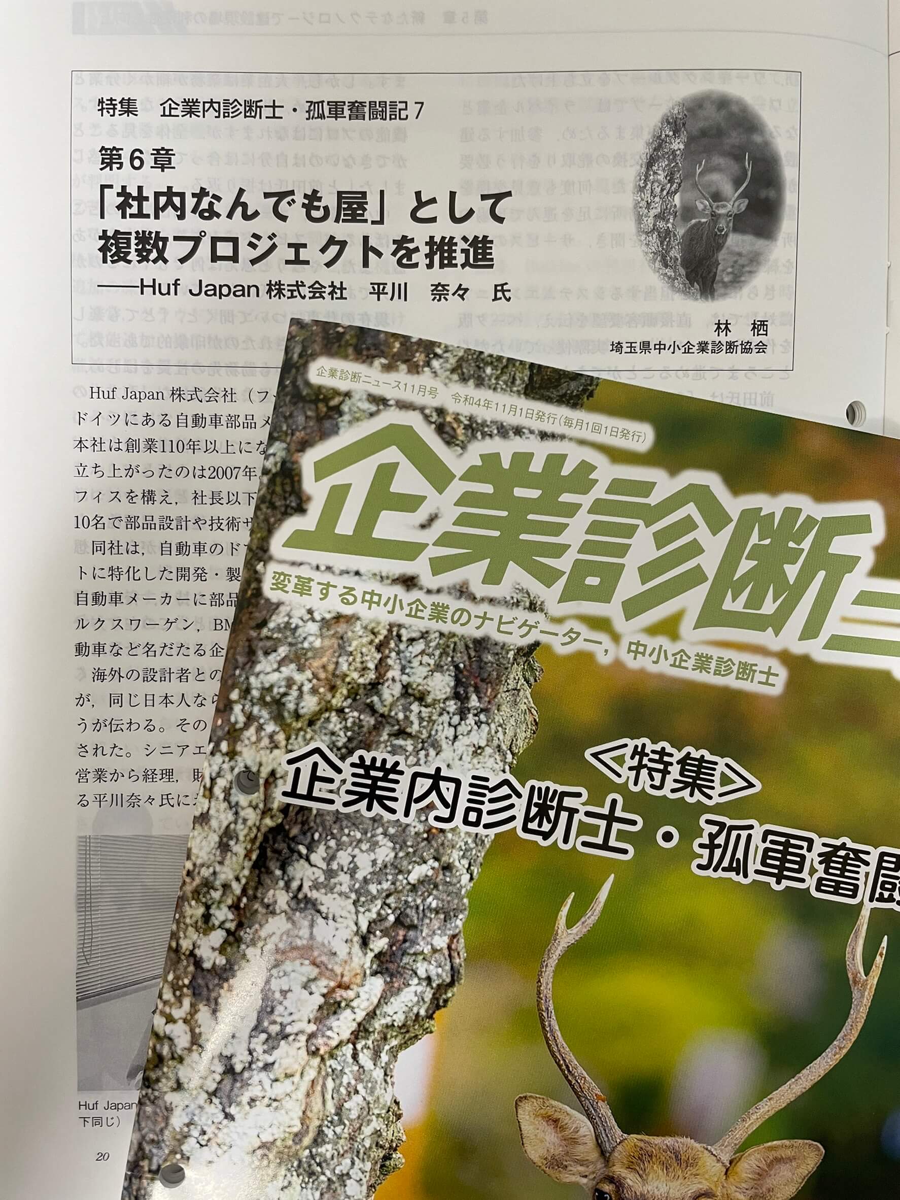 このたび「企業診断ニュース」2022年11月号の特集記事「企業内診断士・孤軍奮闘記7」の第6章で、Huf Japan株式会社(フーフジャパン)の平川奈々さんの取材記事を執筆させていただきました。