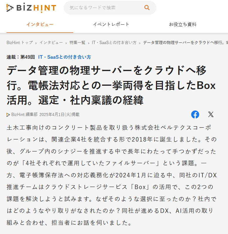 このたびビズヒントで、「データ管理の物理サーバーをクラウドへ移行。電帳法対応との一挙両得を目指したBox活用。選定・社内稟議の経緯」を執筆致しました。