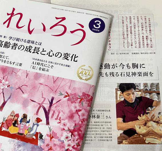 このたび雑誌『れいろう』令和8年3月号「一隅を照らす」にて、「子供の頃の感動が今も胸に――100年先も残る石見神楽面を」を執筆いたしました。