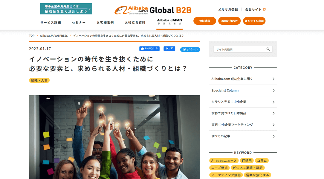 アリババ株式会社が運営するサイト「アリババジャパンプレス」で、「イノベーションの時代を生き抜くために必要な要素と、求められる人材・組織づくりとは?」を執筆しました。
