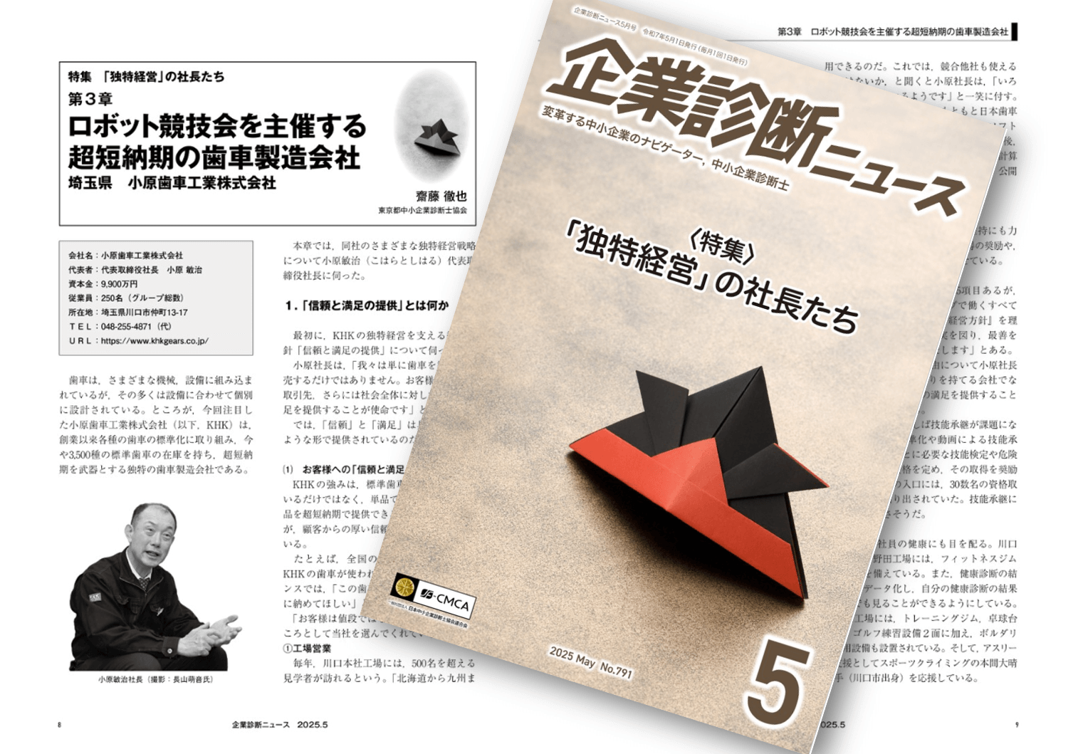 この度,企業診断ニュース 2025年5月号の特集「独特経営の社長インタビュー」において、第3章『ロボット競技会で業界を盛り上げる超短納期の歯車製造会社』で小原歯車工業株式会社様について執筆させていただきました。同社は創業以来歯車の標準化に取り組み、超短納期を武器に今や国外20数か所に代理店を持つまでに成長しています。この成果は年間500名を超える工場見学や,ロボット格闘技大会(KHK杯)の主催,従業員教育を第1に掲げる経営方針などに支えられており,中小企業診断士活動の参考になるものと考えます。是非ご一読ください。