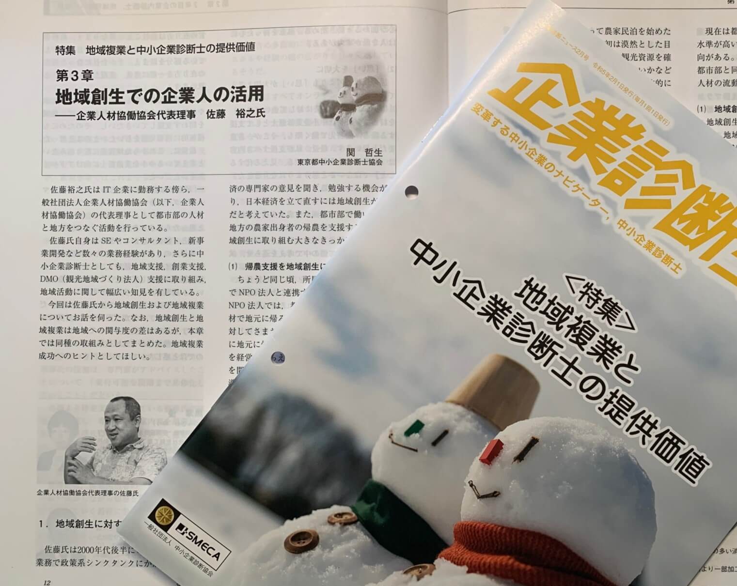 このたび、中小企業診断協会の会報誌『企業診断ニュース』2023年2月号にて、特集「地域複業と中小企業診断士の提供価値」の第3章「地域創生での企業人の活用」で、佐藤裕之さんの取材記事を執筆させていただきました。