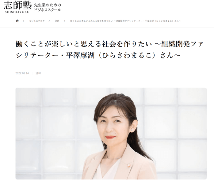 「働くことが楽しいと思える社会を作りたい」という理念のもと、組織こうどう研究所の代表を務め、組織開発ファシリテーターとしてご活躍の平澤さんに、現在に至るまでの歩みや、志師塾との出会いと得たもの、お仕事への想いを伺いました。