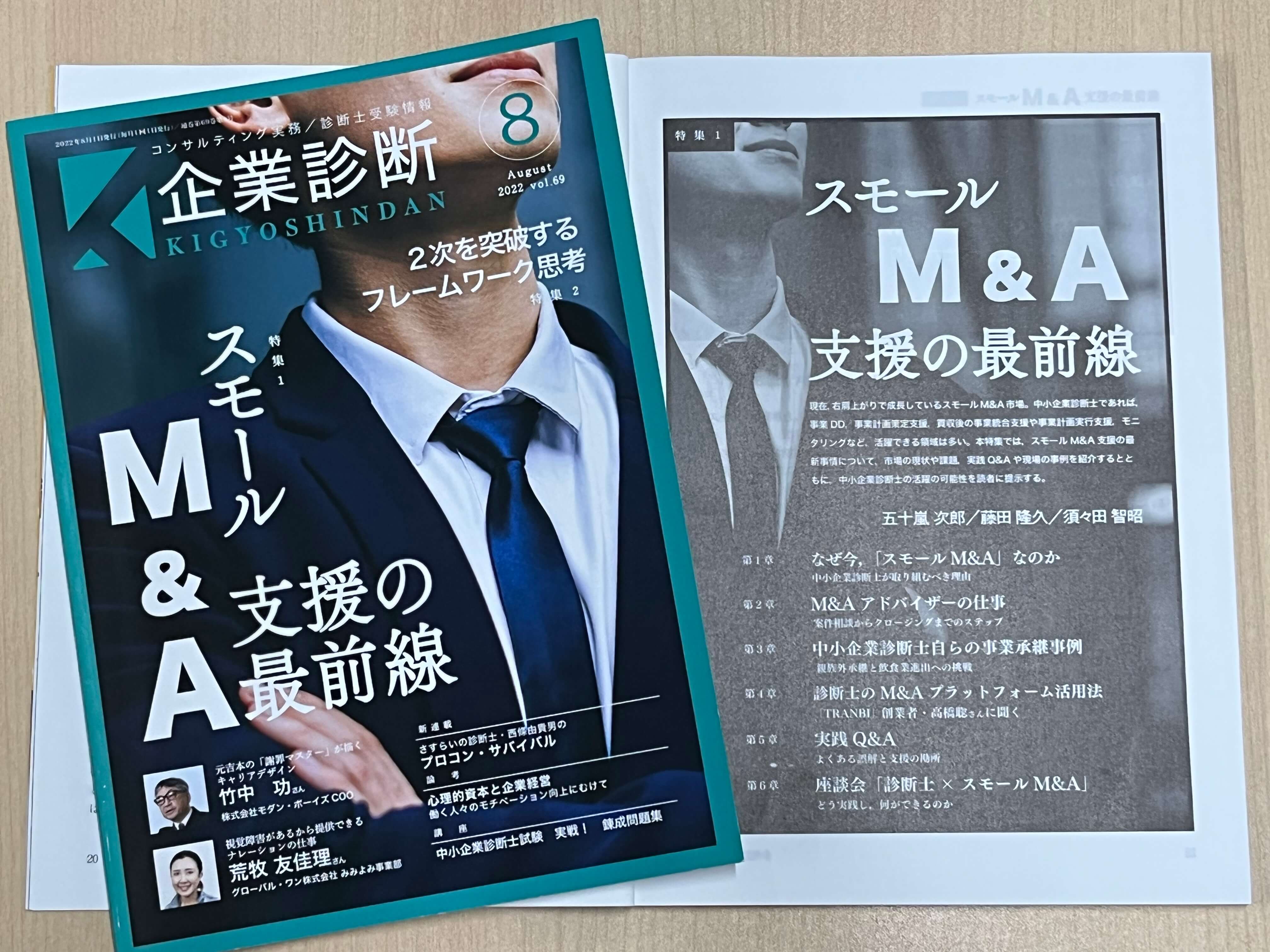 『企業診断』8月号にて、特集「スモールM&A支援の最前線」の全6章のうち、第4章と第6章の執筆を担当しました。