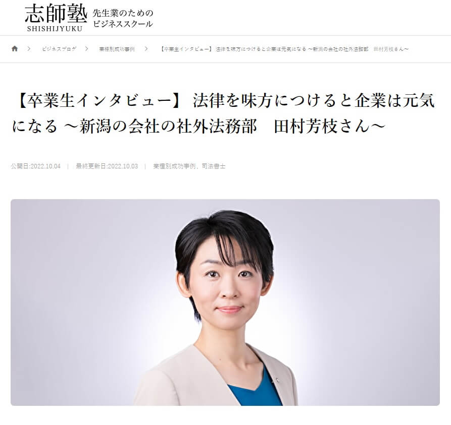 株式会社エクスウィルパートナーズ様の志師塾ウェブサイトにて、志師塾卒業生である田村芳枝さんのインタビュー記事を執筆させていただきました。