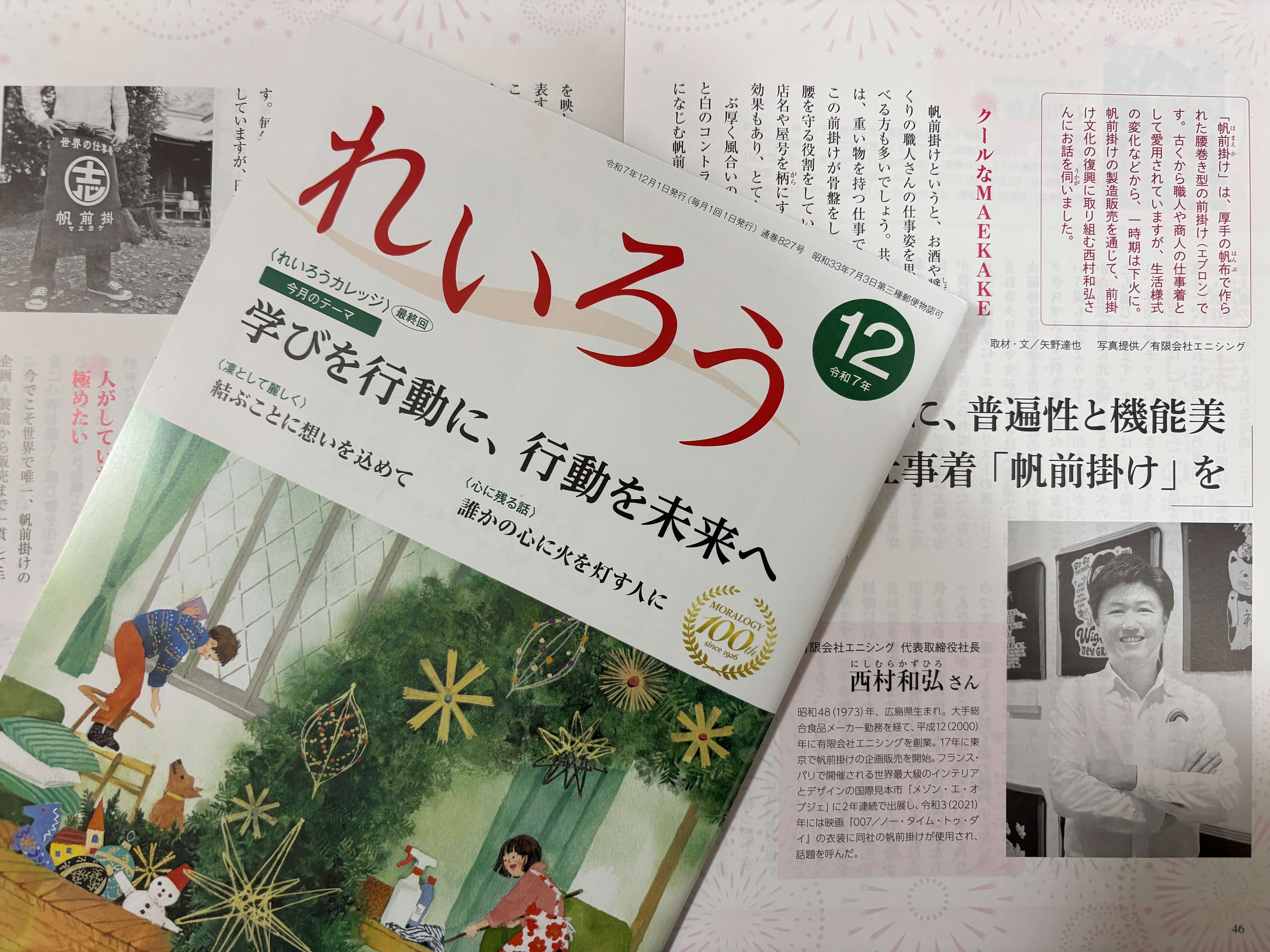このたび、雑誌『れいろう』令和7年12月号「一隅を照らす」にて、「日本に、世界に、普遍性と機能美を宿した仕事着 帆前掛けを」を執筆いたしました。