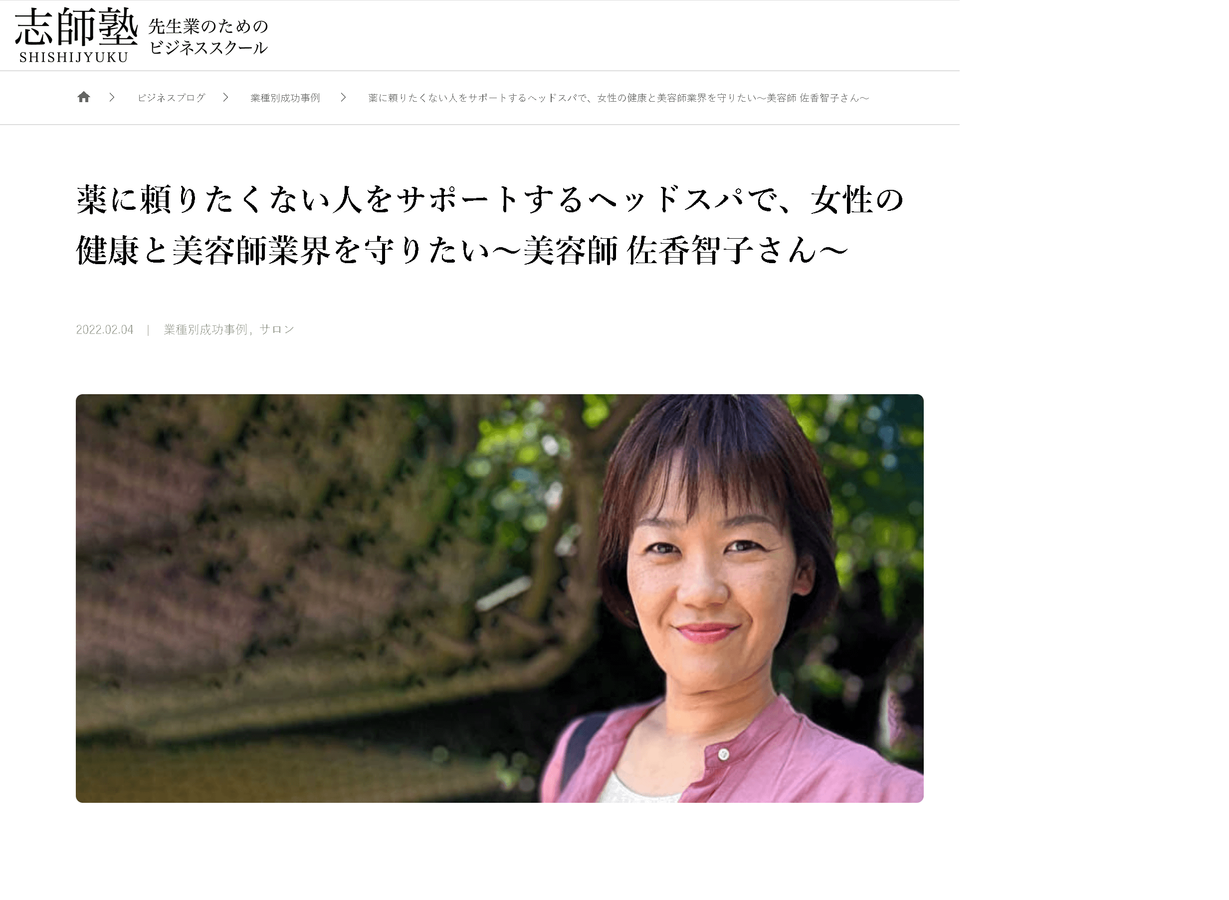 このたび、株式会社エクスウィルパートナーズ様の志師塾ウェブサイトで、ヘッドスパオアシス 佐香智子様へのインタビュー記事を執筆させていただきました。