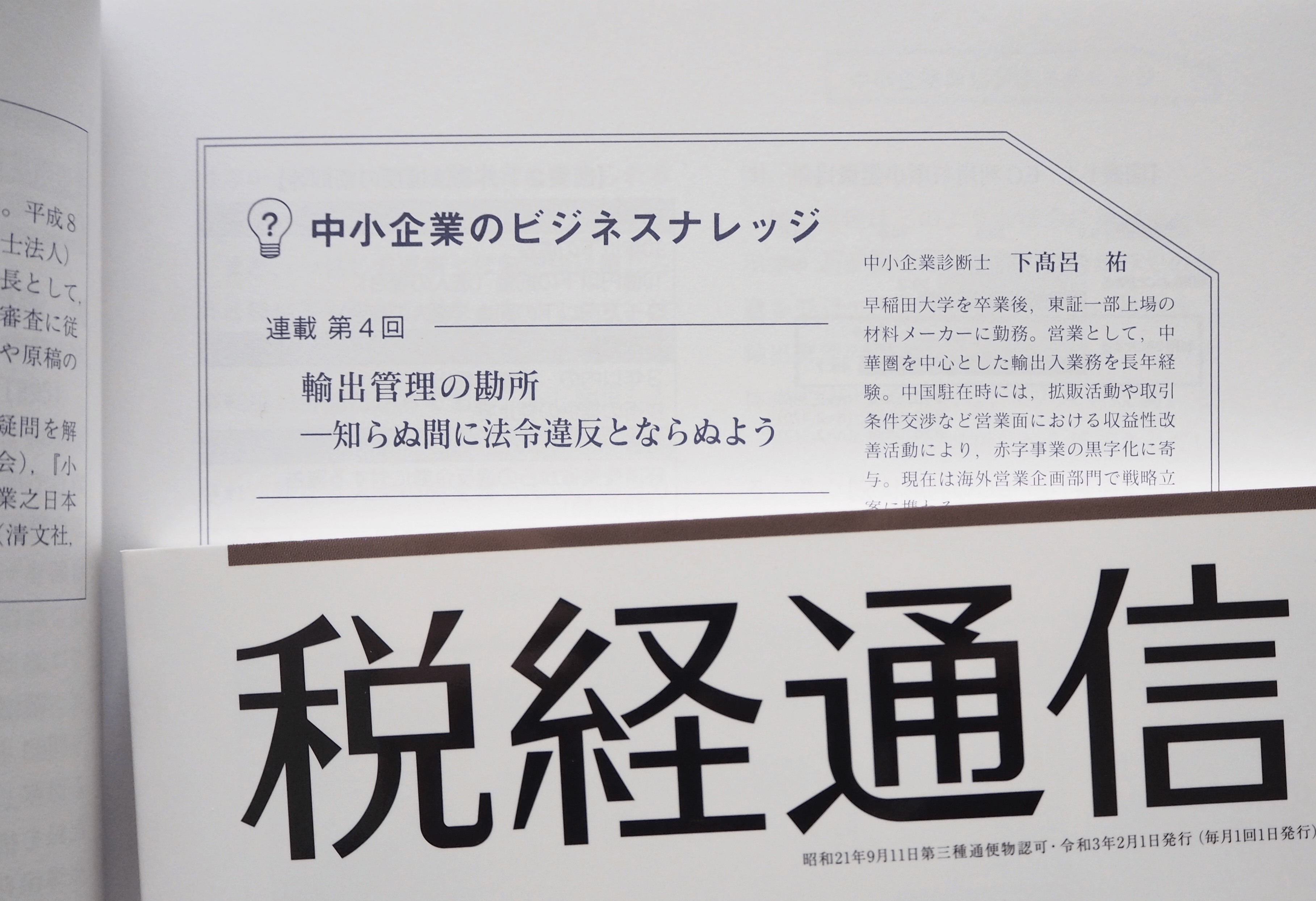 この度、税経通信1月号の連載企画「中小企業のビジネスナレッジ」に、「輸出管理の勘所―知らぬ間に法令違反とならぬよう」を寄稿しました。