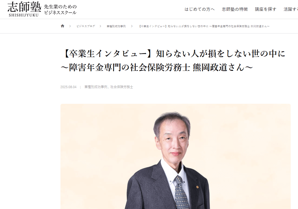 また、志師塾で学ばれた内容を、ホームページや名刺、自己紹介などにしっかりと反映され、着実に成果につなげておられる点にも感銘を受けました。ぜひ、記事をご一読いただけましたら幸いです。