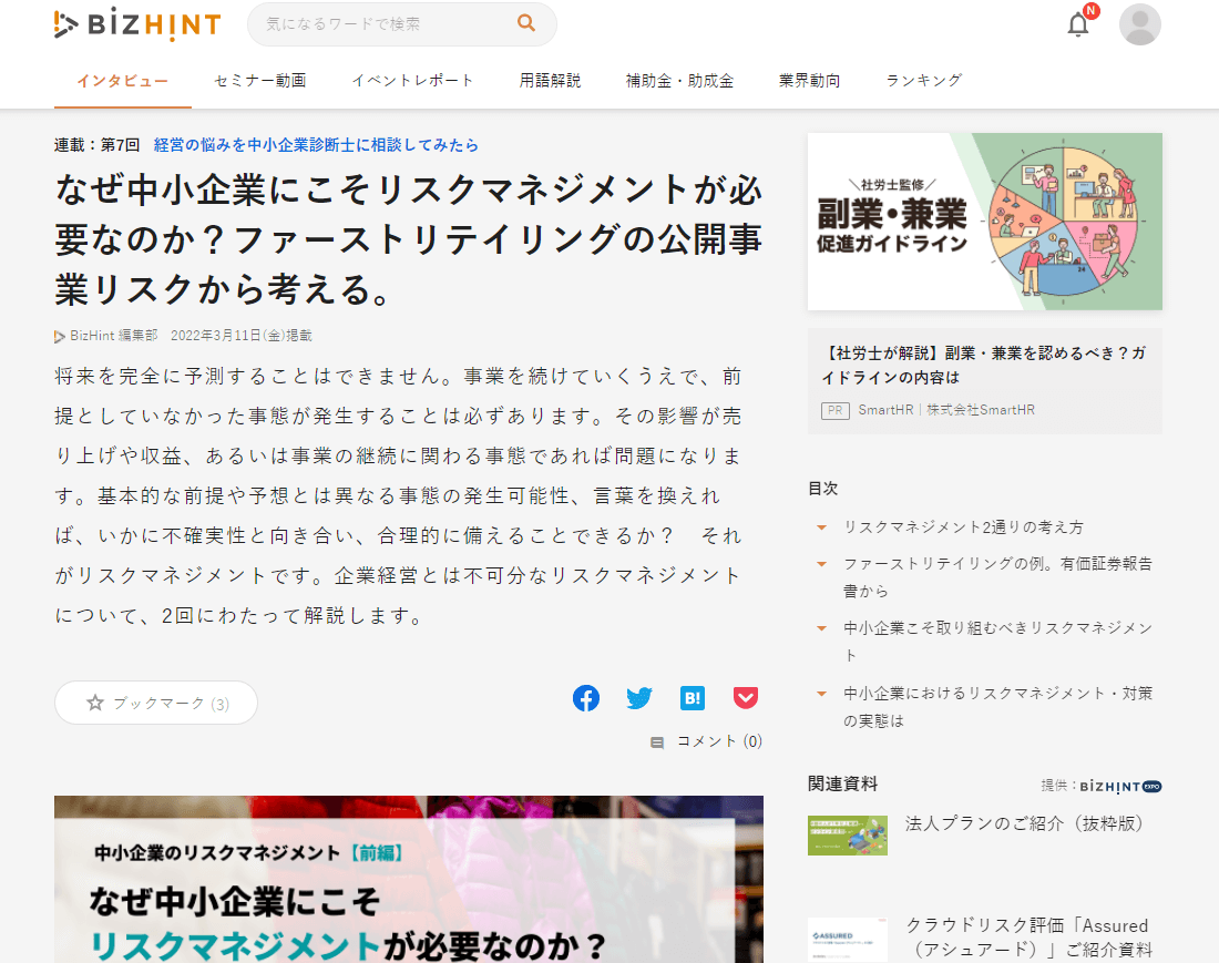 ビジョナル・インキュベーション株式会社様が運営するウェブサイト「BizHint」に、中小企業のリスクマネジメントについて記事を書きました。